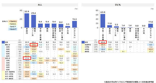 感染経路で高いのは「家庭内」32.9%、次いで「職場・バイト先」29.4%だった。男性は「職場・バイト先」、女性は「家庭内」が最も高い。子どもは「学校・保育園」が63.0%と最も高くなっている。