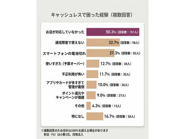 キャッシュレス決済で困った経験を聞いたところ(複数回答)、「お店が対応していなかった」が50.3%(151人)で最多となった。次いで、通信環境や端末の状態など、インフラ・機器に起因するトラブルが上位に挙がった。