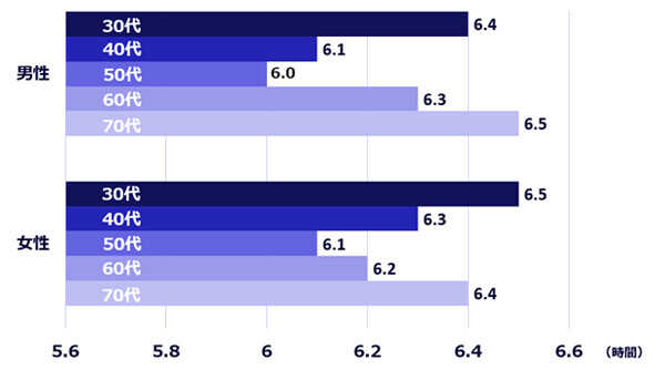 男性50代の平日平均睡眠は6.0時間で、前回同様に全世代で最も睡眠不足の年代だった。働き盛りの世代では仕事や家庭負担が重なり、十分な睡眠時間を確保できていない実態が示唆される。