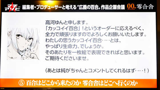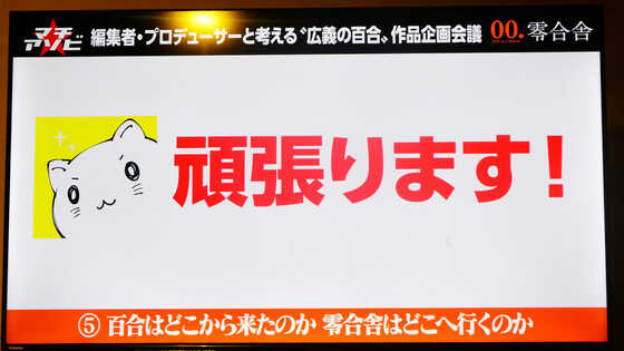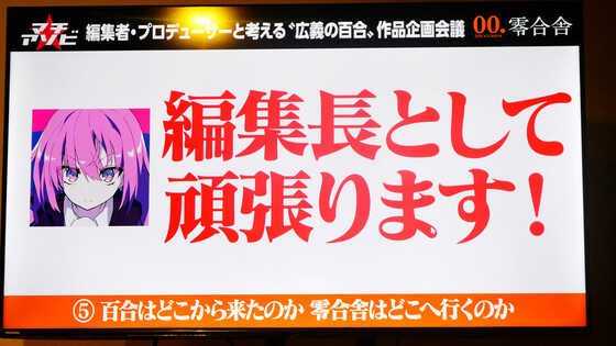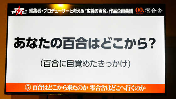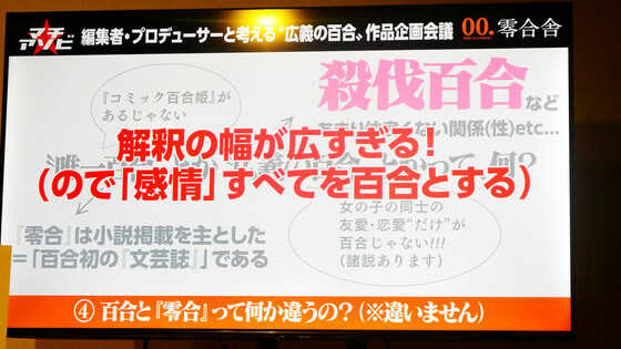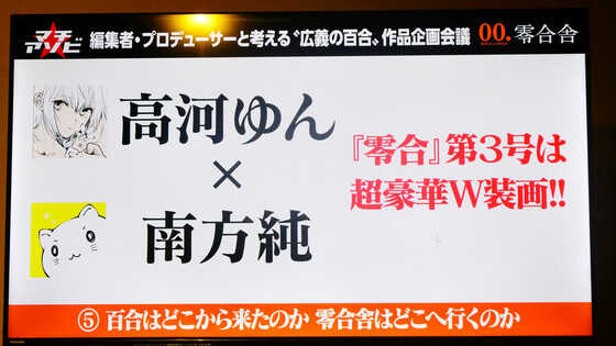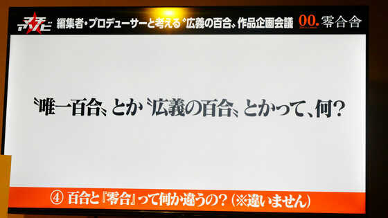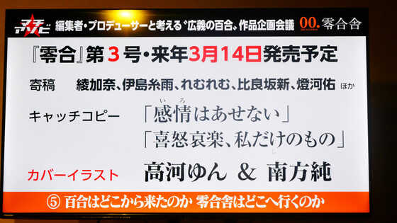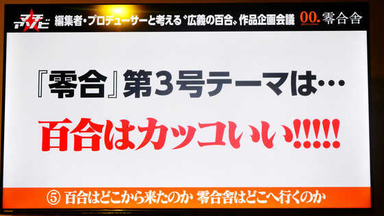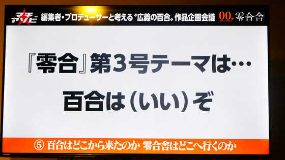 これまでの話を踏まえた上で、これからの零合舎の話に移ります。「零合」第3号のテーマは「百合は(いい)ぞ」とのこと。「いい」に括弧が付いているのがポイント。