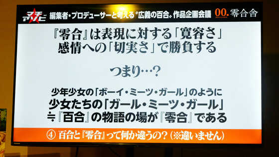 つまり少年少女の物語として「ボーイ・ミーツ・ガール」があるように、少女たちの「ガール・ミーツ・ガール」、すなわち百合の物語の場こそが「零合」であるとれむれむ氏は語りました。