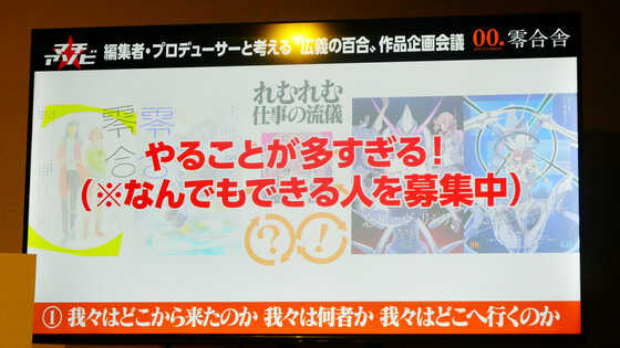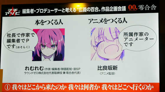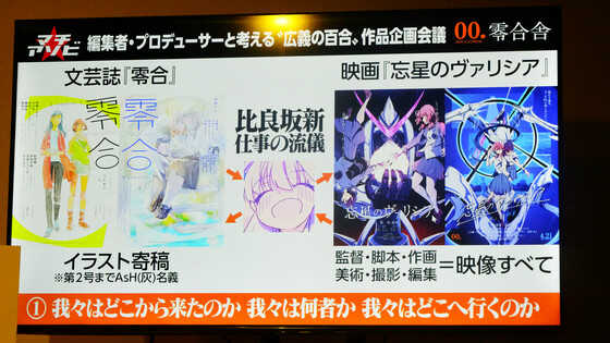 登壇者はれむれむ氏と比良坂氏。れむれむ氏は「零合」の編集者であり、零合舎の代表であり、そして比良坂氏のアニメ『忘星のヴァリシア』の配給・宣伝プロデューサーも務めています。