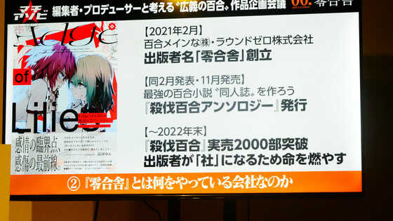 そして、このイベントが開催されるまでのあらすじ。零合舎の設立は2021年2月で、同年11月に「殺伐百合アンソロジー『Edge of lilies』」を発行。「感情の臨界点、感情の最前線」をうたう本誌は、「決して愛だけでなく、殺意や憎悪なども含めたむき出しの感情が2人の間で絡み合う」という百合をテーマにしたアンソロジー本で、実売数は2000部突破。なお、あくまでも零合舎は出版者となっています。