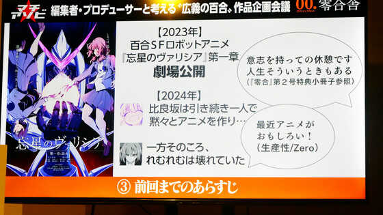 女性同士の友情を超えた関係性を描く作品ジャンルは「百合」と呼ばれ、さかのぼると大正末期から昭和初期に流行した少女小説から始まり、今もなお小説だけでなくアニメや漫画でも扱われています。百合専門文芸誌「零合」を出版する零合舎の編集長であるれむれむ氏、そして百合SFロボットアニメ『忘星のヴァリシア』を1人で作り上げた比良坂新監督によるトークショー「編集者・プロデューサーと考える〝広義の百合〟作品企画会議」がマチ★アソビ Vol.29で開催されました。
