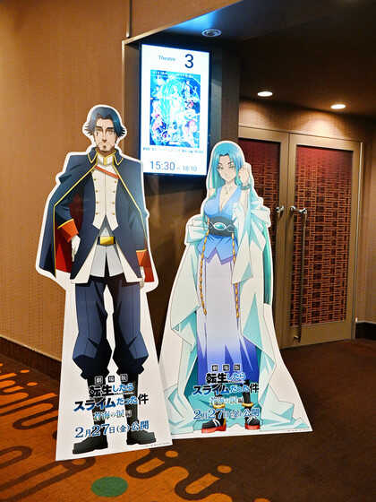 舞台挨拶付き上映が行われたシアターの入口には本作の舞台・カイエン国の大臣であるゾドンと巫女のユラの姿がありました。