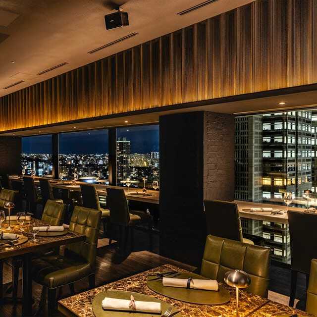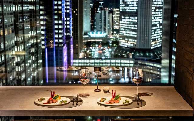 グループでゆったりくつろげるテーブル席のほか、夜景を一望できる窓側カウンター席も用意。車が行き交う大通りを挟むように都庁や高層ビルが立ち並ぶ眺めは、まるで光の回廊のよう! 記念日にふさわしい、特別感たっぷりのひとときが過ごせること間違いなし。
