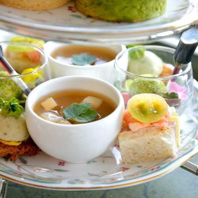 アフタヌーンティーのはじまりに、アミューズとして「新玉葱のポタージュ プティポワピュレ」を提供。