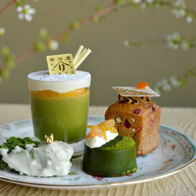 ほうじ茶のケーキには、ラズベリーの軽い酸味。濃厚な抹茶のテリーヌには柚子皮やグレープフルーツのコンポートを添え、味わいに軽さを。