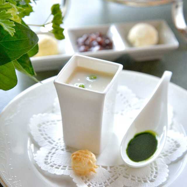 新玉葱のやさしい甘みに、グリンピースの風味が心地よいアクセントとなり、別添えの抹茶ソースで味わいの変化が楽しめるのもうれしい。