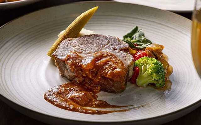 【メイン】豚肩ロースのグリル ナッツと蕗の薹、柑橘のバルサミコソース