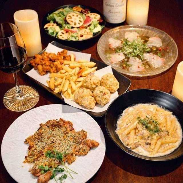 3時間の飲み放題が付いた「こいこい福コース」でいただけるのは、「鮮魚の淡雪カルパッチョ」「こいこい特製フリットミスト3種盛り」「鶏モモ肉のディアボラ風」など、お酒が進むメニュー。パスタは5種の中から選ぶことができ、「アサリのクリームペンネ」「しらすといくらのペペロンチーノ」といった、魚介をたっぷり使ったラインナップに。照明を落としたムーディーな空間で、おいしい料理とお酒に満たされて。