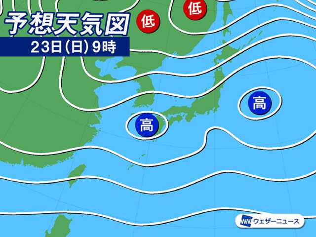 三連休中日の今日23日(日)・勤労感謝の日は東西に勢力を広げる高気圧に覆われ、全国的に晴れる所が多くなります。2つの高気圧の間に入る関東や、上空の気圧の谷の影響を受ける東北北部は雲が広がりやすく、にわか雨がありそうです。