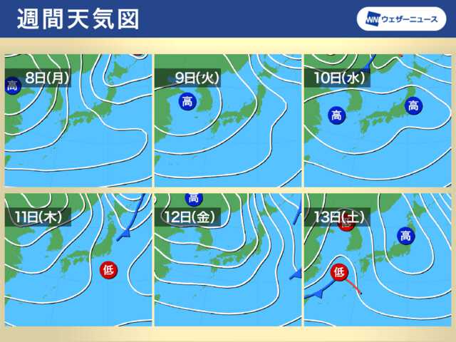 来週末の13日(土)から14日(日)にかけて、西から2つの低気圧が日本付近を通過する見通しです。