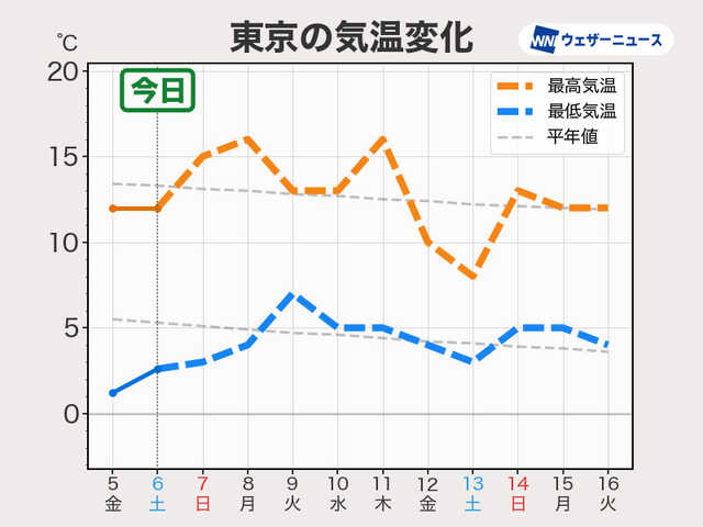北日本では周期的に寒気が流れ込み、気温がグッと下がる日がありますが、おおむね平年並みの寒さとなる見込みです。
