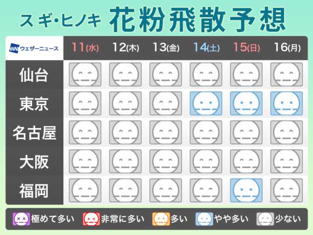 ただ、気温が上がると九州から関東にかけてはスギ花粉の飛散に注意が必要です。既に花粉が飛び始める時期で、風や気温上昇・雨上がりなどの条件次第では、一気に本格的な飛散が始まる可能性があります。花粉症の方は対策を行うようにしてください。