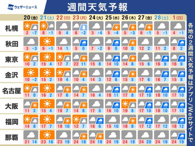 今週末は三連休です。20日(金)から連休初日の21日(土)は北日本など一部で雨や雪が降る可能性があるものの、大きな天気の崩れはない予想です。