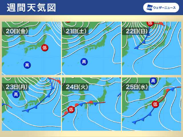 連休明けの24日(火)は、西から次の低気圧や前線が接近し、来週は西日本や東日本の広範囲で天気が崩れる予想です。