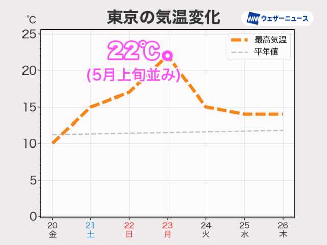 この先、三連休後半にかけてグッと気温が上がります。全国的に3月から4月並の暖かさで、東京は22℃まで上がり5月上旬並みの暖かさになる予想です。