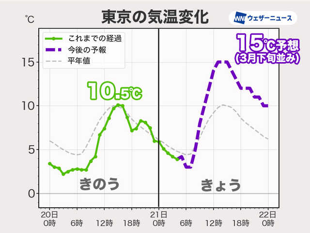 昼間は暖かな空気に覆われる上、日差しがしっかりと届くため、気温が上昇します。広い範囲で15℃を超え、九州のなど一部では20℃近くまで上がる予想です。