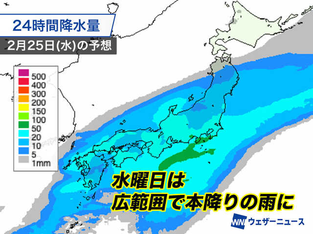 25日(水)になると低気圧と前線がさらに東に進み、東北から九州の広い範囲で雨が降るとみています。前線に向かって流れ込む暖かく湿った空気によって発達した雨雲が流れ込む太平洋側のエリアでは一時的な強雨や雷雨に注意が必要です。