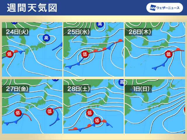 26日(木)になると天気がいったん回復しますが、27日(金)になると新たな低気圧と前線が本州の南岸を通過。28日(土)にかけて再び雨のエリアが東に拡大する予想です。