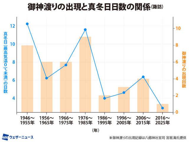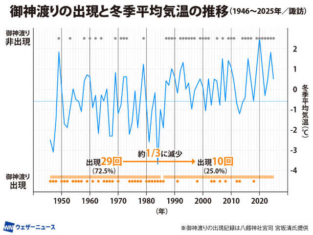 1946〜2025年までの出現記録を見ると、1946〜1985年の40年で29回も出現していた御神渡りが、1986年以降に激減。2025年までの40年では約1/3の10回しか見られませんでした。
