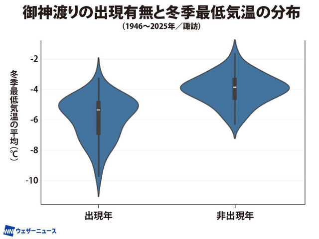 「諏訪の気温に関するさまざまな気象データと御神渡りの出現データを検証したところ、『冬季の平均気温の上昇』や『-10℃を下回る強い冷え込みの頻度の減少』が、御神渡りの出現に極めて強い相関関係を持つことが示されました。