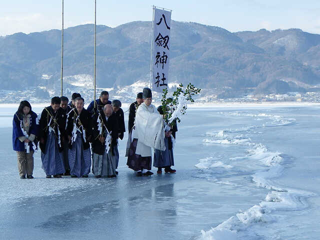 御神渡りとは、諏訪湖の湖面が寒さで凍り、その亀裂から氷が山脈のように隆起する現象です。湖の端から端へ筋が走るさまが「神様がお渡りになった跡」とされ、古くから御神渡り神事が受け継がれてきました。