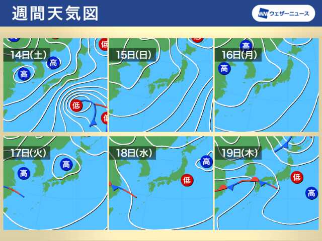 西高東低の冬型の気圧配置となるため、15日(日)にかけて日本海側では雲が広がりやすく雨や雪の所もありそうです。