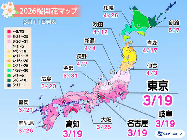 19日(木)〜三連休初日の20日(金)春分の日にかけては低気圧や前線の影響で西日本や東日本で雨の降る可能性があります。桜の開花を促す「催花雨」になるかもしれません。