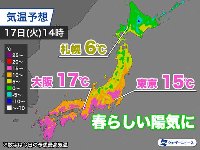 今日3月17日(火)は高気圧に覆われ、全国的に晴れて穏やかな空が広がります。西日本から中部は日差しがたっぷりと届き、最高気温が15℃を超える地点が多くなる見込みです。暦の上では今日が「彼岸入り」となりますが、お墓参りにも適した春らしい暖かさの一日となります。