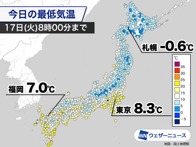 8時00分時点の最低気温は、福岡7.0℃、大阪6.3℃、名古屋5.3℃、東京8.3℃と、西日本や東日本の各地で5℃を上回り、朝の冷え込みは控えめです。