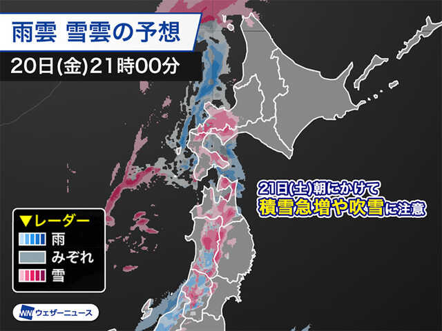 明日21日(土)朝にかけて局地的に雪が強まり、積雪が増加するおそれがあります。