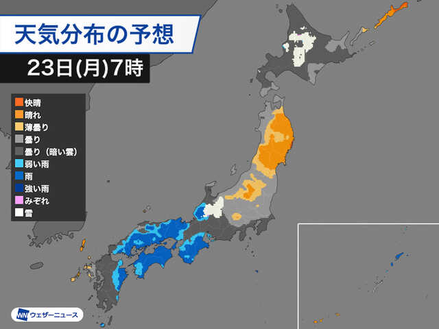 連休明けの23日(月)は、低気圧が本州の南岸を東進するため、西日本から東日本の広い範囲で雨が降る見込みです。北日本も別の低気圧の影響で日本海側を中心に雨や雪の降るところがありそうです。