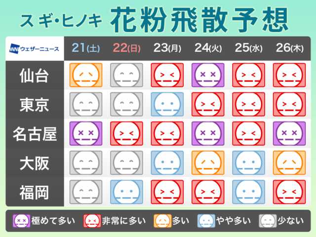 ただ、花粉の飛散はピークを迎えていて、東北から九州にかけてスギ花粉が大量に飛散しているほか、西日本や東日本ではだんだんとヒノキ花粉の飛散が本格化する予想です。症状の出やすい方は、引き続きの万全の対策が欠かせません。