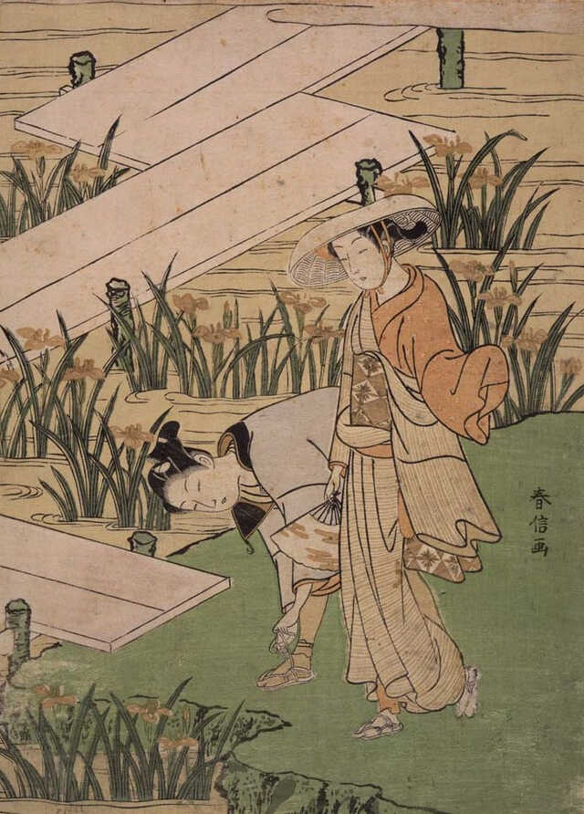 複雑に架けられた八橋(やつはし)のほとりに咲くカキツバタを見て、「かきつばた」の5文字を句の頭に置いて、都の妻を想う和歌を詠む場面は特に有名です。