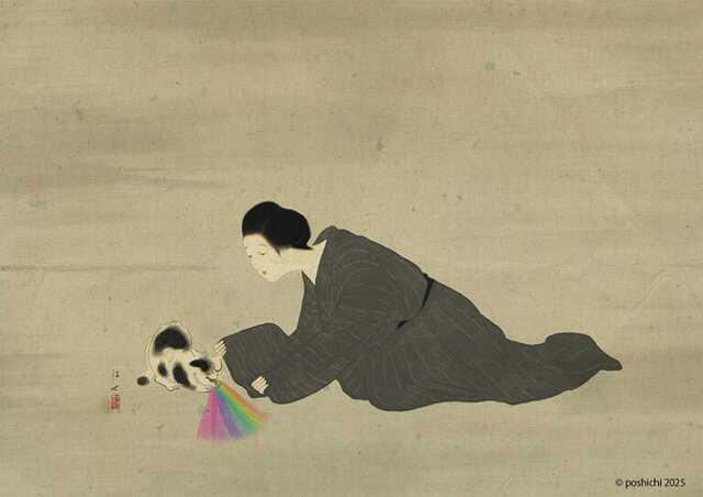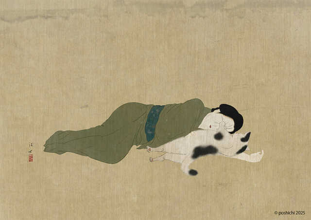 poshichi(ぽ七)の作品は、一見すると日本画のような落ち着いた質感が印象的ですが、実はすべてiPadを使ったデジタルアート。古典的な絵柄と現代的なテーマの組み合わせが独特のユーモアとシュールさを生み出しており、国内のファンはもちろん、海外のフォロワーも多く獲得しています。