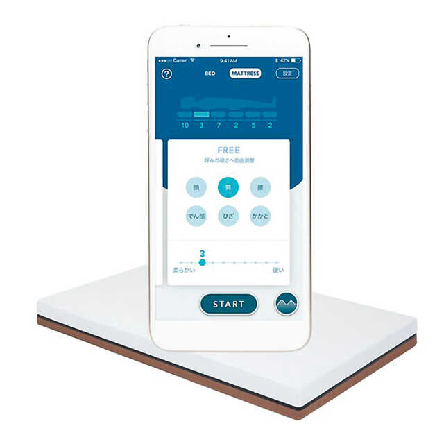 睡眠計測センサー“Active Sleep ANALYZER”をマットレスの下に設置するだけで、日々の睡眠を計測。また、専用アプリから睡眠データのモニタリングが可能。さらに、硬めから柔らかめまで気分に合わせて100万通りの寝心地を選べる。