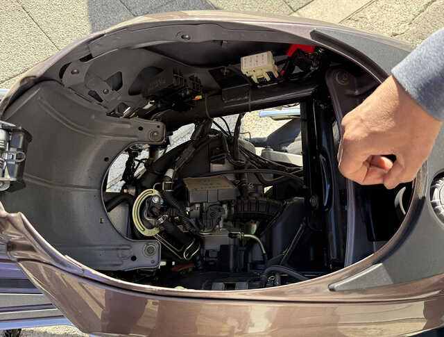 一方、ランブレッタの最新モデルは、先進機能と実用性満載なモデルでもあります。まず、シート下はメットインボックスとなっていて、このボックスをさらに外すと、電気系統やキャブレターなどがお目見え。メンテナンスなどの際に、手を入れやすい利点があります。
