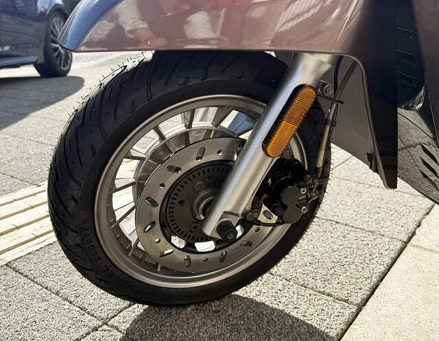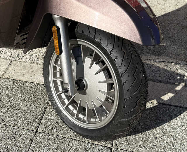 このボディの構造は伝統的なスチール・モノコック形式で、他の現代のスクーターにはない高剛性を実現しています。また、足回りは、古典的なドラムブレーキのようにも見えますが、これはあくまでもデザイン的なアクセント。実際はディスクブレーキを採用していて制動性も十分です。