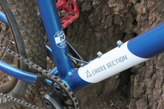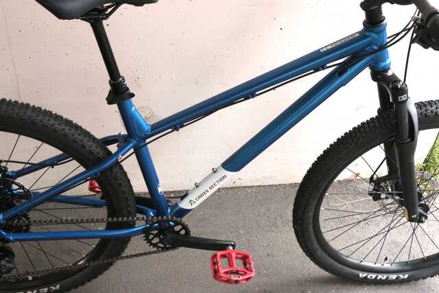 ヘッドアングルと呼ばれるフロントフォークの角度は68°。ハンドリングを決める重要な要素ですが、荒れた山道を下っても、街中の交差点を曲がってもクセのない自然なものに仕上げられています。クロスセクションは、オフロードバイクのパーツなどを手掛けるダートフリークというメーカーの自転車ブランドですが、オフロードを走るのが好きな開発者が繰り返し試走した上で決めたこだわりの数値だとか。