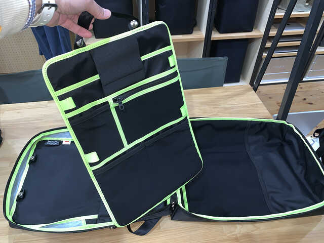 佐野 もともと最初に20Lを作った時に、飛行機の機内でパネルケースだけ外して手の届く場所に置けるようにしたい、という考えからなんですね。例えば、機内でレッドアイ・フライト(深夜出発のフライト)や長時間フライトで、機内が暗い時でもある程度ポケットのレイアウトがわかるようにその色を使っています。もちろん、お客さんによってはその部分も「ブラックが欲しい」とご希望されたり、オール蛍光カラーのお話もいただくのですが、それだとレイアウトがわかりづらかったり、色によっては汚れが目立ったりするんですよ。