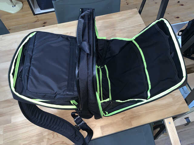 佐野 コチラはパッキングスペースとして一部屋、パネルと小物用のポケットを含めたデバイス、ガジェット用の部屋として一部屋の2ルーム構造にしました。より効率的に仕分けしやすくしています。