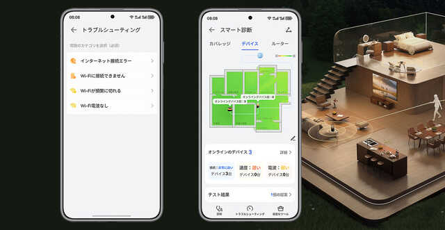 また、独自技術のHUAWEI WiFi Mesh+を搭載しており、強固なメッシュネットワークによって家中を網羅。子機を組み合わせることで、奥まった部屋や階上の部屋でも超高速かつ安定したネット接続ができ、「HUAWEI AI Life」アプリによって家中の電波状況をリアルタイムでチェックできます。