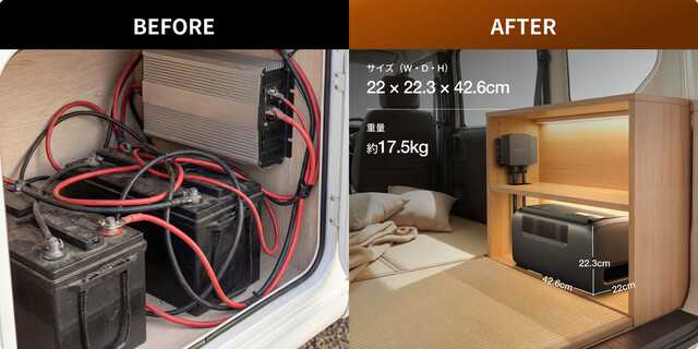 そうして実現したのが2000Whクラスとしては小型の22×22.3×42.6cm。立てても寝かせても使えるカタチなので、例えばスペースの制約が大きい車中泊時の車内などでは助かること間違いなし。ハンドルを引き上げるタイプではなく、本体に持ち手が付いているので、シンプルな直方体になっている点も設置のしやすさ動かしやすさにつながっています。ちなみに重さは17.5kgなので、同クラスとしては一般的ですね。
