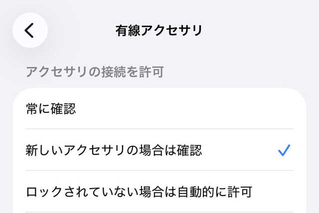 そして有線アクセサリ画面には、「常に確認」と「新しいアクセサリの場合は確認」、「ロックされていない場合は自動的に許可」、「常に許可」という4つの選択肢が存在します。iOS 26の初期値は「ロックされていない...」ですが、自分がどのようにiPhoneを使うかを考慮し設定を見直しましょう。
