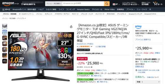 記事作成時点では価格も未発表。Amazonで「27"ゲーミングモニター DualSense充電フック付き」に近いWQHD解像度の27インチゲーミングモニターを確認したところ、ASUSの「TUF Gaming VG27AQ3A」は3万3131円が記事作成時点ではセール価格で2万5980円になっていました。