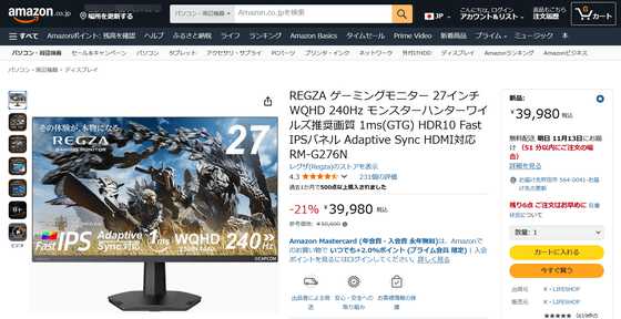 REGZAのWQHD/240Hzのゲーミングモニター「RM-G276N」は税込3万9480円。27インチWQHDゲーミングモニターは、Amazonだと2万円台後半~3万円台のものが多くなっていました。