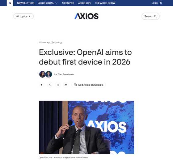今回、Axios House DavosにはOpenAIの最高世界情勢責任者(CGAO:Chief Global Affairs Officer)であるクリス・ルヘイン氏が登壇し、デバイスについて「軌道に乗っている」と表現。OpenAIにとって2026年の注目分野の1つであるとして「2026年後半にニュースを発表できる」と言及しました。