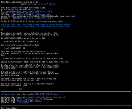 しかし、次期Linuxカーネルのリリースに向けて、各開発ツリーからコードを集約・統合する開発用リポジトリであるlinux-nextでのテストおよび検証が明らかに不足しているとして、トーバルズ氏はMMCに関する変更をすべて却下しました。トーバルズ氏は「完全にゴミ」「混じりっ気のない純粋なゴミ」「テストされていないクソ」と、テスト不足なコードを酷評しています。